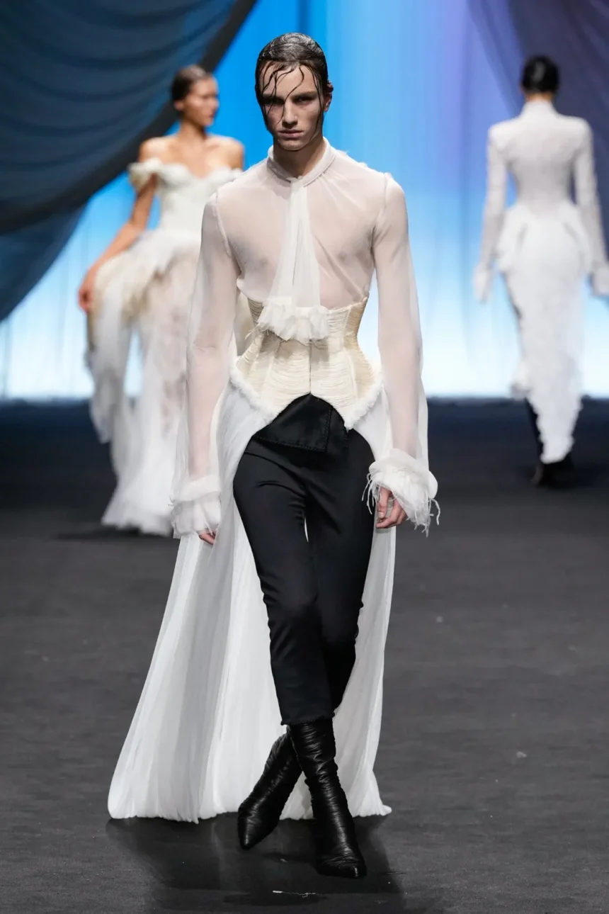 Rumor has it that this may be the end of Gaultier’s guest designer series. If so, de Saint Sernin delivered a finale as daring as the house itself: a final look of angular corsetry and breeches that fused his modern edge with Gaultier’s iconic silhouette.