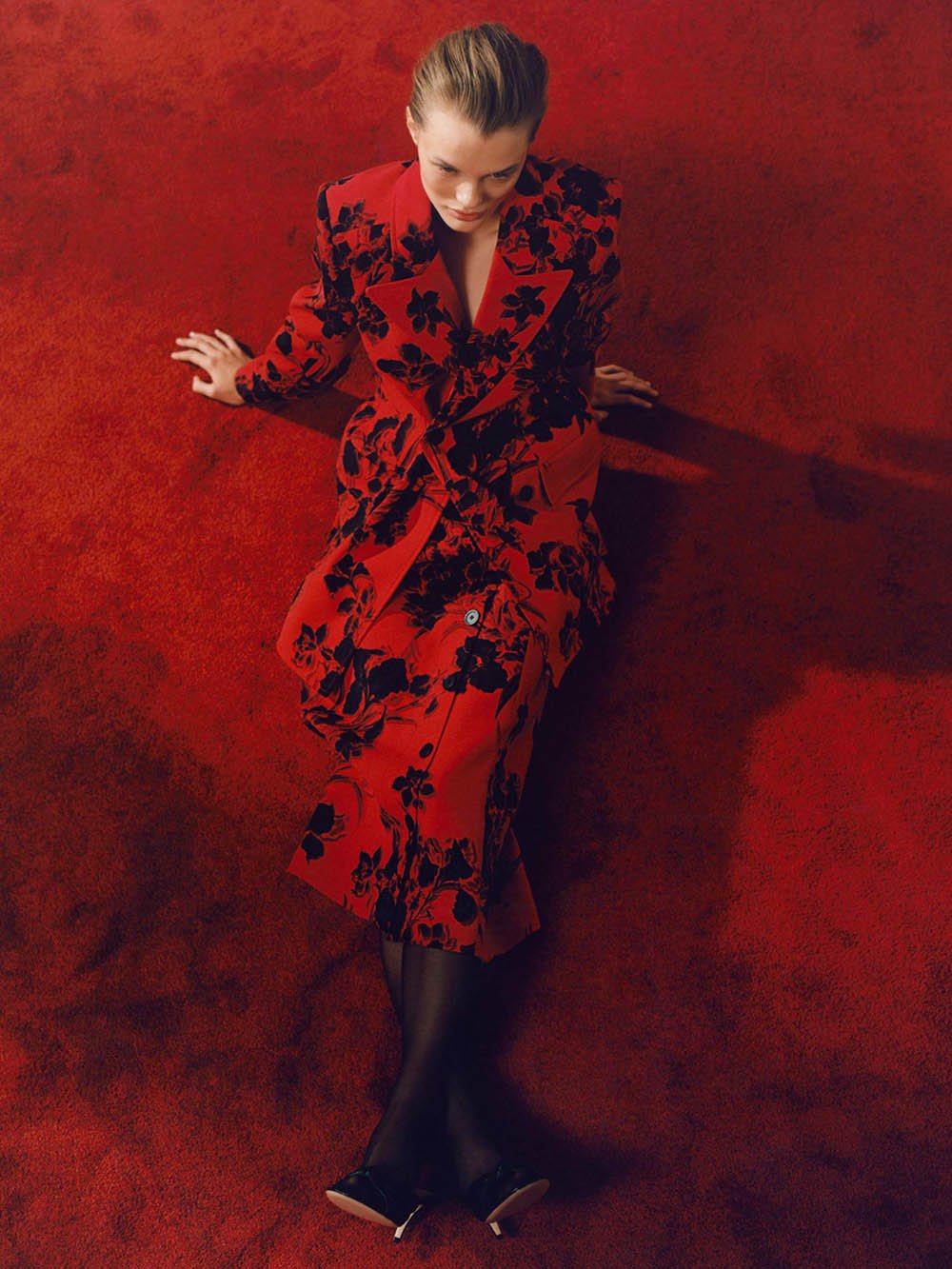 For the cover story named ‘’Bring The Party Home’’, styled by Helen Broadfoot, the Russian beauty poses in labels such as Acne Studios, Prada, Balenciaga, Love Stories, Gucci, Sprwmn, Miu Miu, Paco Rabanne and Bottega Veneta.